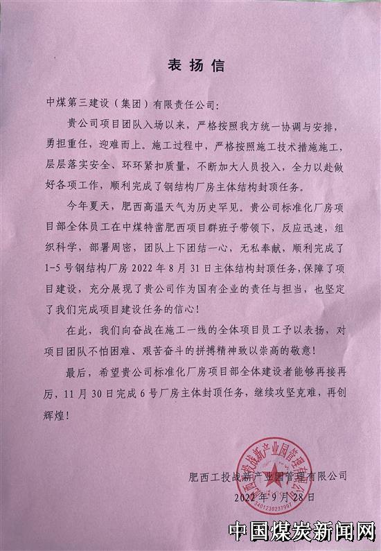 【本网讯】近日,中煤矿建特凿公司肥西工投战新产业园管理有限公司向中煤矿建特凿公司发来表扬信,对该公司肥西经开区繁华大道标准化厂房EPC项目施工团队高效、顺利完成1-5号厂房主体结构封顶任务表示感谢,对奋战在施工一线的全体参建者予以表扬。