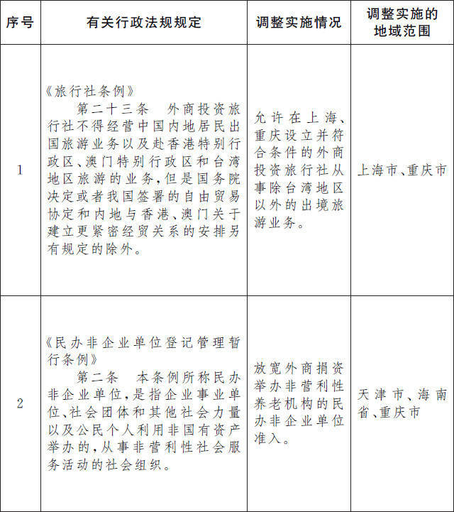 中国政府网站10月8日消息,国务院发布关于同意在天津、上海、海南、重庆暂时调整实施有关行政法规规定的批复。 按照《国务院关于同意在天津、上海、海南、重庆开展服务业扩大开放综合试点的批复》(国函〔2021〕37号),国务院同意自即日起至2024年4月8日,在相关省市暂时调整实施《旅行社条例》、《民办非企业单位登记管理暂行条例》的有关规定。 国务院有关部门、相关省市人民政府要根据上述调整,及时对本部门、本省市制定的规章和规范性文件作相应调整,建立与服务业扩大开放综合试点相适应的管理制度。 国务院将根据相关省市服务业扩大开放综合试点情况,适时对本批复的内容进行调整。 国务院决定在天津、上海、海南、重庆暂时调整实施的有关行政法规规定目录