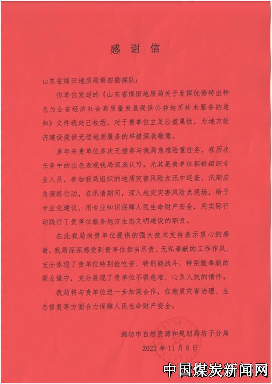 | 山东省煤田地质局第四勘探队收到潍坊市自然资源和规划局坊子分局感谢信 | |||