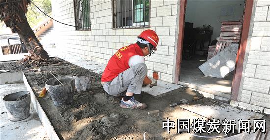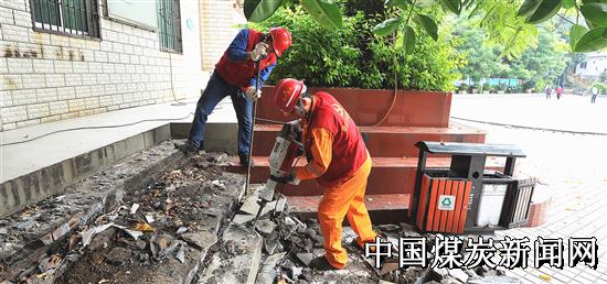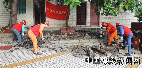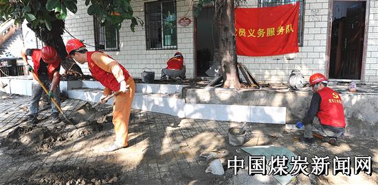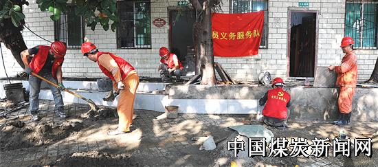 小宝鼎煤矿党员“红帽子”给综合服务队办公区域道路铺设地板砖