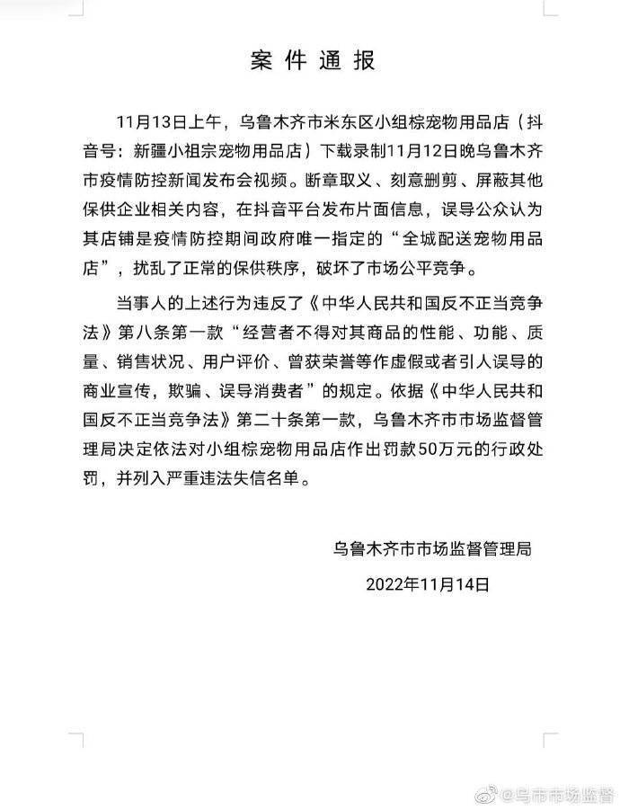 乌鲁木齐市市场监督管理局官方微博11月14日通报,小组棕宠物用品店被罚款50万元。