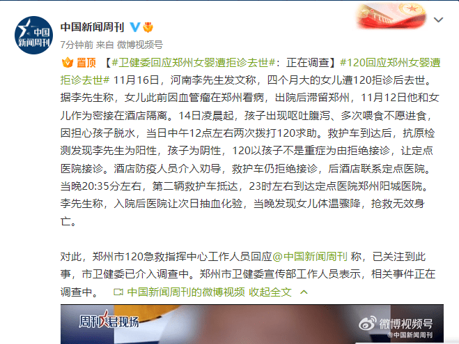 【#卫健委回应郑州女婴遭拒诊去世#:正在调查】#120回应郑州女婴遭拒诊去世# 11月16日,河南李先生发文称,四个月大的女儿遭120拒诊后去世。据李先生称,女儿此前因血管瘤在郑州看病,出院后滞留郑州,11月12日他和女儿作为密接在酒店隔离。14日凌晨起,孩子出现呕吐腹泻、多次喂食不愿进食,因担心孩子脱水,当日中午12点左右两次拨打120求助。救护车到达后,抗原检测发现李先生为阳性,孩子为阴性,120以孩子不是重症为由拒绝接诊,让定点医院接诊。酒店防疫人员介入劝导,救护车仍拒绝接诊,后酒店联系定点医院。当晚20:35分左右,第二辆救护车抵达,23时左右到达定点医院郑州阳城医院。李先生称,入院后医院让次日抽血化验,当晚发现女儿体温骤降,抢救无效身亡。 对此,郑州市120急救指挥中心工作人员回应@中国新闻周刊 称,已关注到此事,市卫健委已介入调查中。郑州市卫健委宣传部工作人员表示,相关事件正在调查中。