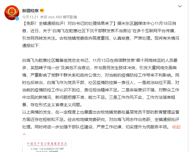 据米东区融媒体中心11月18日消息,近日,关于“白海飞在乾惠社区下沉干部群发表不当言论”在多个互联网平台传播,引发网民转发关注。古牧地镇党委政府高度重视,认真核查,严肃处理。现将有关情况通报如下: 白海飞为乾惠社区筹备组党总支书记,11月13日在微信群发表“哪个网格转运的人员最多,奖励辣子鸡一份”及其他不当言论,并与居民发生肢体冲突,引发大量网络负面舆情,严重影响了党群关系和政府公信力,对当前的疫情防控工作带来不利影响。同时也反映出,白海飞作为党员干部、社区疫情防控第一责任人,一是政治站位不高,对当前的疫情防控工作认识不到位,责任担当精神不足。二是宗旨意识不强,对群众工作中出现的新情况、新问题把握不准,能力不足。三是工作作风不实,工作方法简单粗暴,存在形式主义官僚主义问题。 以上舆情的发生,在一定程度上也暴露出古牧地镇党委在基层党员干部的教育管理监督方面还存在短板和不足。经古牧地镇党委研究,对白海飞同志作出免职、全镇通报批评处理。同时将进一步加强干部队伍建设,严肃工作纪律,切实提升为民服务本领。