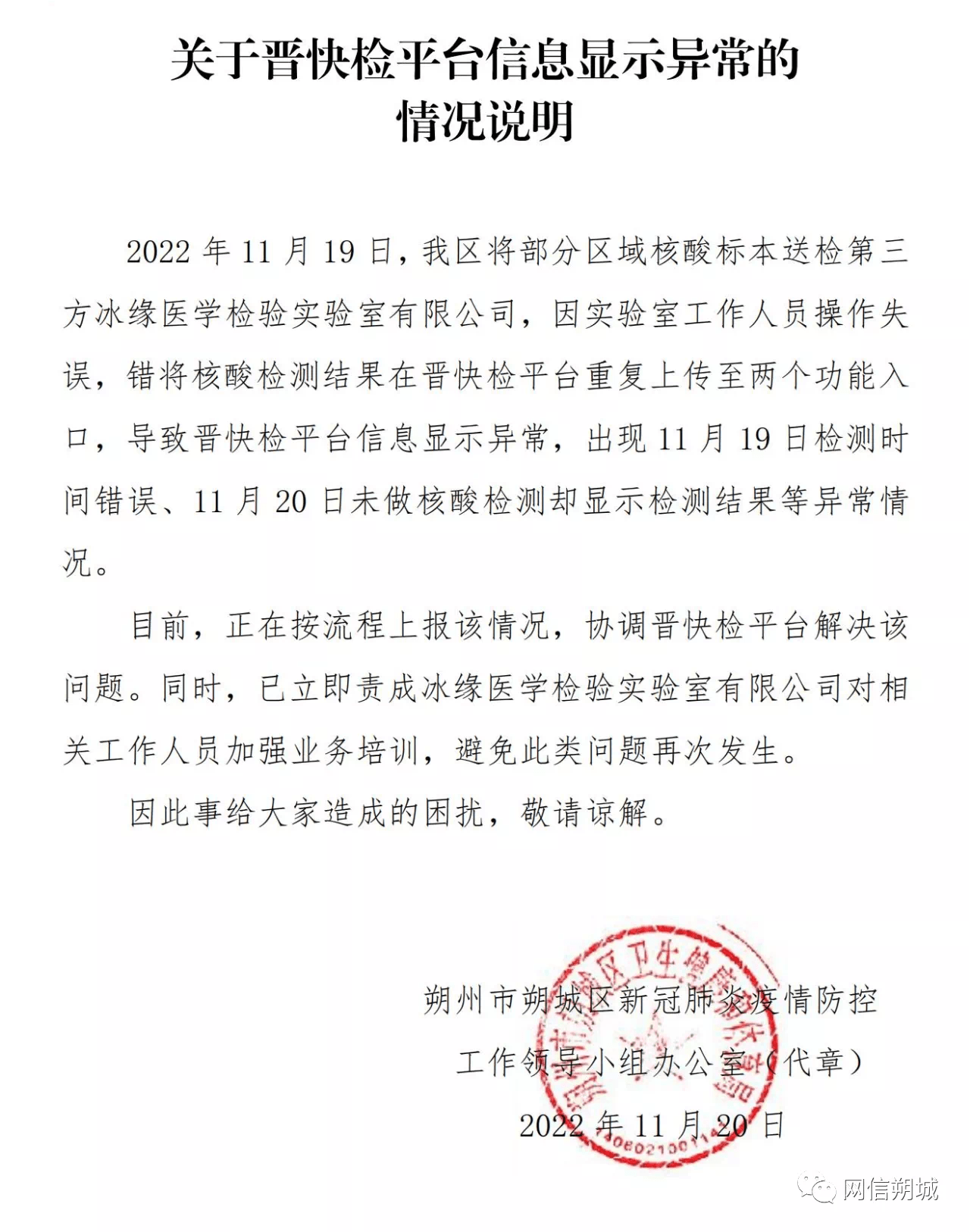 新京报讯 据网信朔城官微消息,11月20日上午,朔城区网友热议晋快检平台信息显示异常。对此,朔州市朔城区新冠肺炎疫情防控工作领导小组办公室经过调查核实,出具了情况说明。
