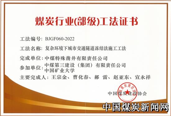 【本网讯】近期,中煤矿建特凿公司编制的“复杂环境下城市交通隧道冻结法施工工法”荣获2020~2022年度煤炭行业(部级)工程建设工法。