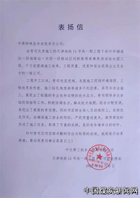 | 中煤矿建特凿公司天津地铁11号线一期工程7标联络通道项目部喜获甲方表扬信 | |||