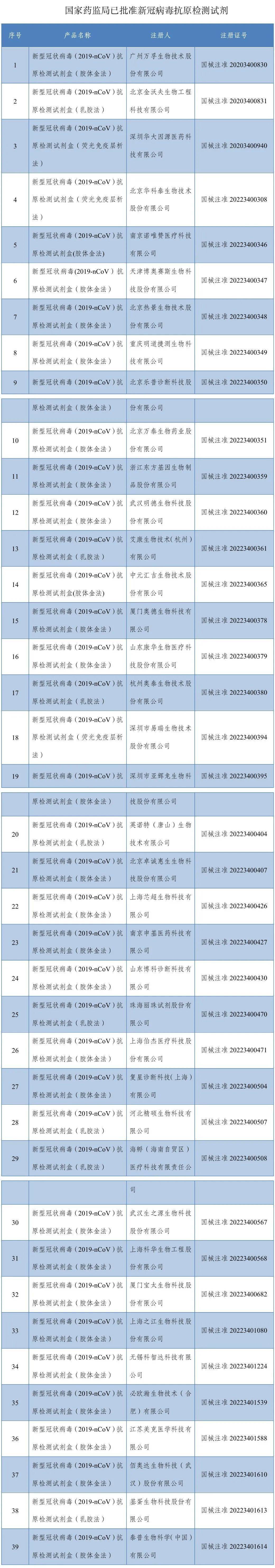 国家药监局已批准39个新冠病毒抗原检测试剂