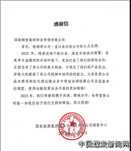 12月8日,国能煤炭经营财务管理公司收到煤焦化公司销售中心发来的感谢信,对该公司在疫情影响、煤炭市场频繁波动的情况下保障代理运输业务正常开展表达感谢。
