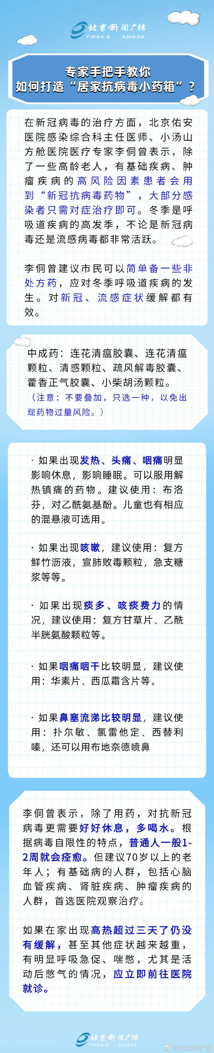 《光明日报》今日刊发《做好健康防护 理性储备药物》一文指出,“当前,奥密克戎病毒致病力在减弱。”国务院联防联控机制医疗救治专家组成员王贵强表示,我国治疗呼吸道感染的药物有充足储备。家里可以适当储备一些解热镇痛的日常药物,但没有必要去抢购、囤积。“保持良好的身体状态,合理膳食、适当运动、良好心态以及充足的睡眠,是提升免疫状态非常好的办法。” 提醒:这种行为或耽误治疗 盛吉芳提醒,不要随意根据网上的一些信息,不加分辨地自行吃药,以免耽误治疗,尤其要当心药物对儿童可能造成的伤害。“冬天是传染病的高发季节。如果身体不适,特别是发高烧,怀疑自己感染新冠病毒了,一定要马上去发热门诊看病,把自己的旅居史、活动史和接触史,如实告诉医生,以利于早发现。”她还指出,如果没有出现感冒的症状就提前把药吃了,并不能预防生病,反而会增加肝脏等器官的负担,得不偿失。 在李侗曾列出的备药建议中,也有一处“注意”事项,即对于连花清瘟胶囊、清感颗粒、疏风解毒胶囊等中成药,等中成药,不要叠加,只选一种,以免出现药物过量风险。 上官河想起曾读过的两则新闻,都是因乱吃感冒药酿成恶果的案例。 一则是“宁波晚报”9月3日的报道:初三学生小华(化名)有感冒发热、腹泻的症状。家长想着,去医院的话,要到发热门诊就诊,还要做核酸检测等,太耽误时间,于是找来家里的5种常用药让小华服下,其中有西药,也有中成药。两天后,小华退烧了,腹泻也止住了,但她总觉得身子软绵绵的,很恶心,比前几天更难受。无奈之下,妈妈带小华来到宁波市第一医院就诊。经检查,小华的血肌酐指数超标了近一倍,尿检也有蛋白尿、血尿。临床诊断为急性肾间质肾炎,考虑与药物有密切相关性。另一个初三孩子由于鼻塞咽痛,口服了多种常备药,也出现了肾功能的损伤。 这个案例告诉我们,常备的退烧药、中成药可治病也可致病。 另一则是“潇湘晨报”10月8日的报道:长沙11岁女孩果果(化名)受凉后出现了咽痛等感冒症状,在家服药2天后,果果出现了呕吐、腹痛等症状,家长陪同到长沙市中心医院(南华大学附属长沙中心医院)儿科就诊后,发现孩子肝功能严重受损,医生仔细询问后,得知孩子2天内先后服用了7种药物,初步判断肝损害与服用多种药物有关。 这个案例则告诉我们,即便是普通感冒,仍建议在医生指导下用药,掌握药物用量,了解其适应症和禁忌症,切勿自行服用药物,尤其是同时服用多种感冒药。 对于幼儿,刘国辉还特别提醒,选用对症药物,比如儿童退烧药、儿童止咳药、儿童化痰药,是在去医院等待就诊前的间歇缓解症状时使用,特别不建议使用抗病毒药物,因为很多药物对于婴幼儿来说,其安全性还没有得到验证,因此,幼儿患病应尽早到医院就诊,在医生的指导下治疗。 资料来源:澎湃新闻、科技日报、浙江新闻、潇湘晨报、宁波晚报