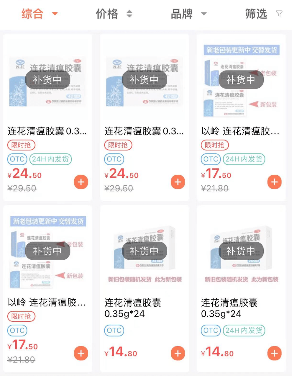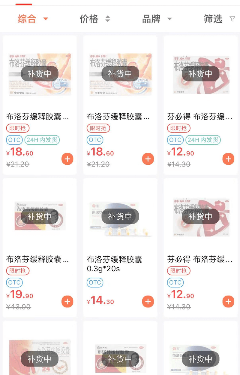 记者走访部分药店后发现,不少药店内连花清瘟胶囊和布洛芬已经售罄。也有少部分药店还有货,0.35gx36粒装的连花清瘟胶囊价格为21.9元/盒,布洛芬缓释胶囊0.35gx10x2板价格为14.3元/盒。 第一财经记者查询电商平台后也发现,不少平台的连花清瘟和布洛芬都处于缺货状态。记者走访了部分药店后也发现了类似情况。