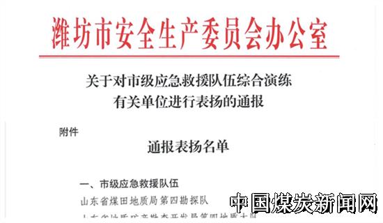 【本网讯】近日,山东省煤田地质局第四勘探队收到山东省潍坊市安全生产委员会通报表扬,表彰该队在潍坊市级应急队伍综合演练中的出色表现。