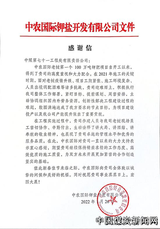 | 佳绩频传赢贺信 喜迎新春开门红 ——中煤七十一处四个海外项目喜获甲方贺信 | |||