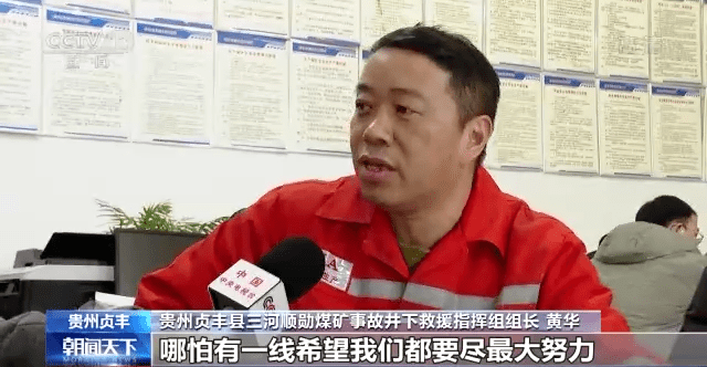 贵州贞丰县三河顺勋煤矿事故井下救援指挥组组长 黄华:我们要争分夺秒地抢救被困的矿工,哪怕有一线希望我们都要尽最大努力,争取尽早地把被困的矿工抢救出来。 (总台记者 苟顺庭 张杰 孙胜利 宋琦媛)