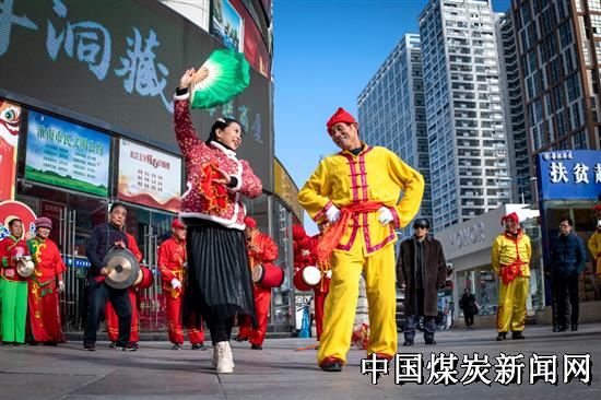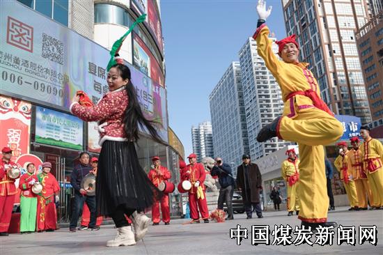 2月1日,大年初一,煤城淮南街头热闹非凡,国家级非物质文化遗产——凤台花鼓灯业余爱好者与上窑民俗年味花鼓灯即兴表演,共庆新年,祝福冬奥。