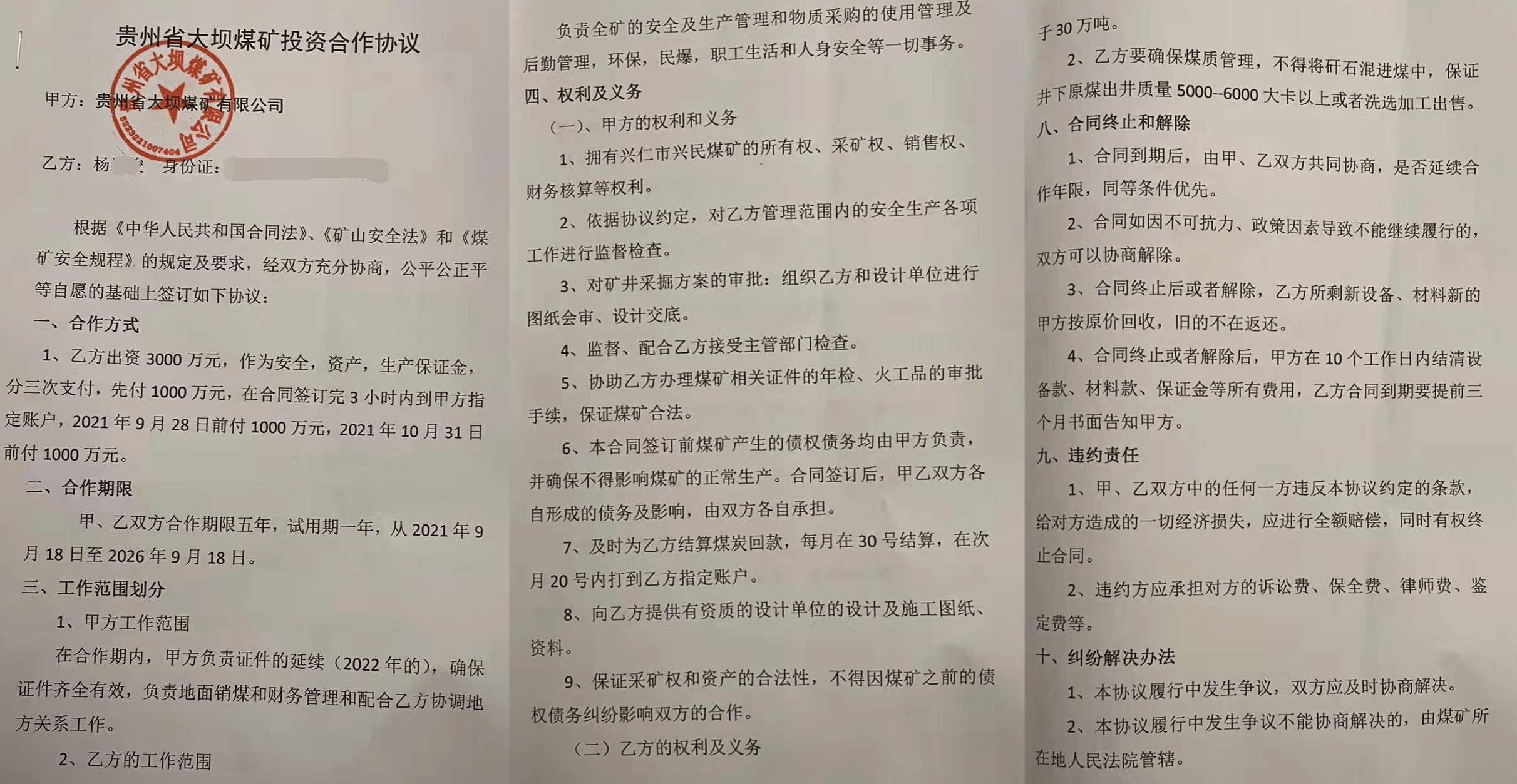 2022年,煤矿承包人杨某将贵州省大坝煤矿有限公司及其代理人周某起诉,原因是煤矿公司提供假图纸并违反双方协议私下售卖煤炭,周某挪用保证金为私用,侵害自身合法权益。 杨某与周某经朋友认识后,周某就有意将贵州省大坝煤矿有限公司兴仁市下山镇兴民煤矿承包给杨某,向杨某出具了兴民煤矿采掘工程平面图,表示其中有两大采区,一采区70-80万吨储量,二采区1000多万吨储量,两采区的F1断层落差仅0-15米,这种优质的采矿条件说服了杨某。 出于对周某的信任,而后又经过初部调查,杨某与被告贵州省大坝煤矿有限公司于2021年9月18日签订了《贵州省大坝煤矿投资合作协议》,协议中规定,杨某出资3000万元作为安全、资产、生产保证金,分三次支付,先付1000万元,在合同签订完3小时内转账到甲方指定账户;2021年9月28日前付1000万元,2021年10月31日前付1000万元,此外大坝煤矿公司要向杨某提供有资质的设计单位的设计及施工图纸、资料。