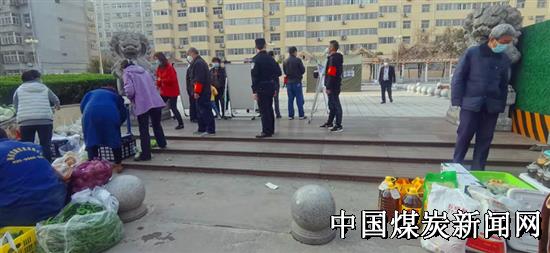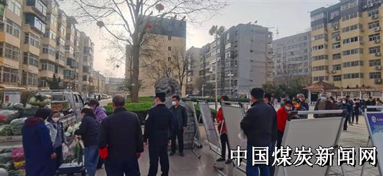 在小区广场,物业服务志愿者有序组织小区住户拉开间隔、排队进行选购,解决防控疫情期住户“买菜难”的问题,让群众在家也能吃到放心菜。