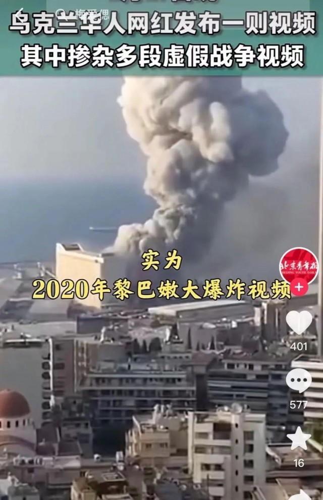 据北京青年报消息,2月27日晚,乌克兰华人网红@达莎梅爱偲 发布一则视频,将2020年俄罗斯阅兵飞行彩排、2020年黎巴嫩大爆炸视频掺杂其中,引发误导。