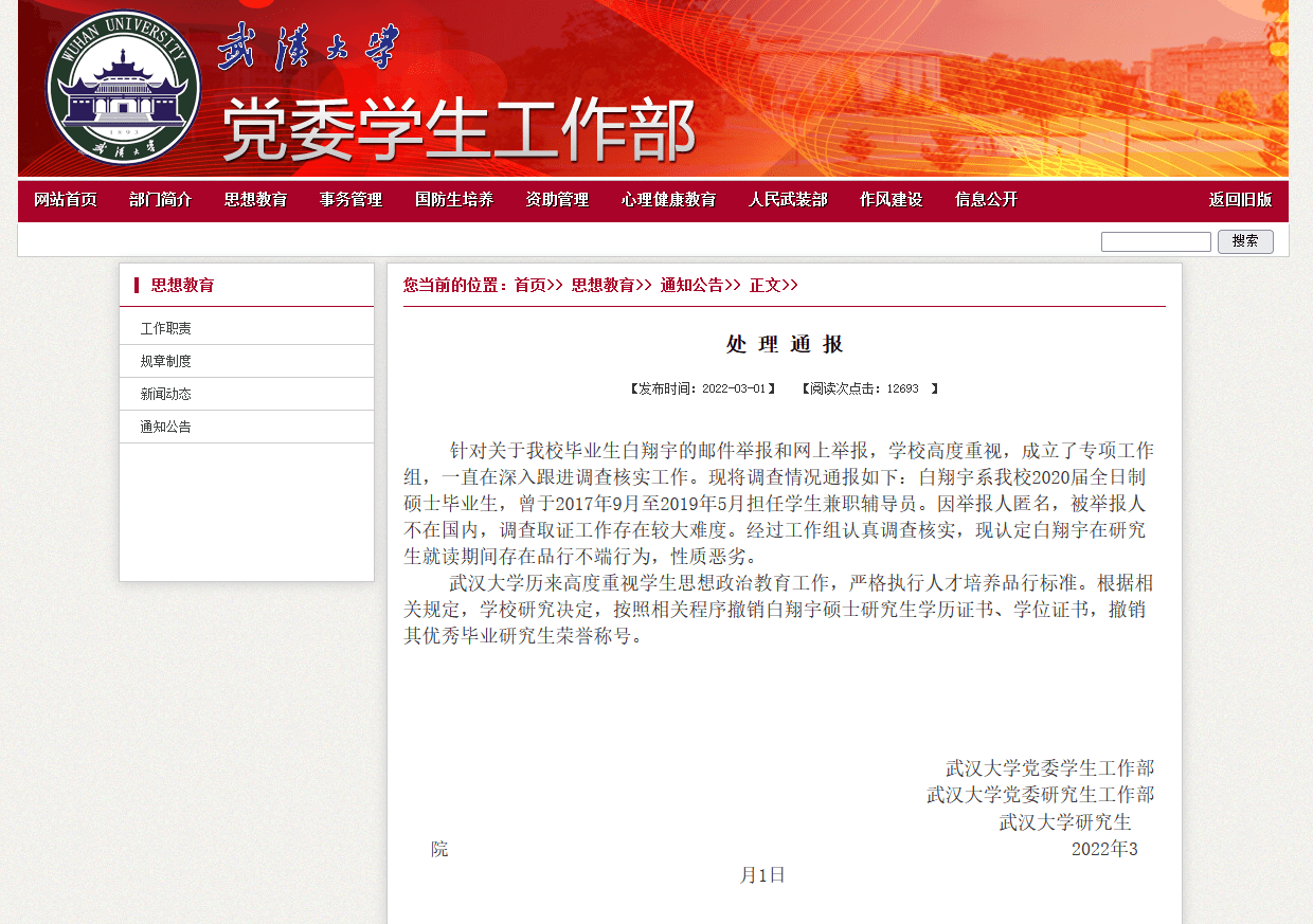白某与受害女性对话截图。图片来源:微博 通报全文如下: 针对关于我校毕业生白翔宇的邮件举报和网上举报,学校高度重视,成立了专项工作组,一直在深入跟进调查核实工作。现将调查情况通报如下:白翔宇系我校2020届全日制硕士毕业生,曾于2017年9月至2019年5月担任学生兼职辅导员。因举报人匿名,被举报人不在国内,调查取证工作存在较大难度。经过工作组认真调查核实,现认定白翔宇在研究生就读期间存在品行不端行为,性质恶劣。 武汉大学历来高度重视学生思想政治教育工作,严格执行人才培养品行标准。根据相关规定,学校研究决定,按照相关程序撤销白翔宇硕士研究生学历证书、学位证书,撤销其优秀毕业研究生荣誉称号。 武汉大学党委学生工作部 武汉大学党委研究生工作部 武汉大学研究生院 2022年3月1日