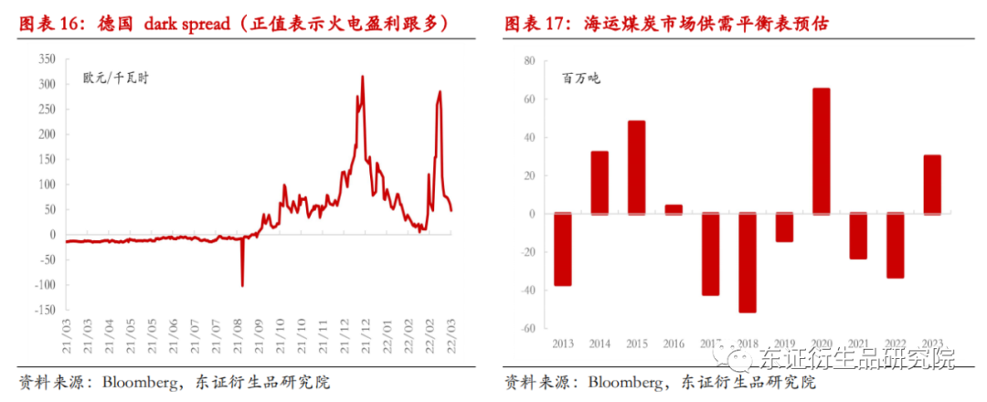 ★ 伴随俄乌冲突演变,海外煤价近期急涨急跌 俄罗斯作为基础资源品输出大国,近一个月来俄乌冲突导致环欧洲市场能源价格暴涨暴跌。2月25日至3月8日,欧洲API2煤炭期货由168美元/吨上涨至421美元/吨,累计涨幅150%。俄罗斯在黑海地区的运输3月8日恢复后,海外能源价格从极高位置快速回落。随着俄乌直接冲突缓和,原油价格跌回90-100美金/桶,海外煤炭价格长期将如何演绎?本文将回顾海外煤炭市场供需情况,并对进口煤价格做出展望。 ★ 海外煤炭供应:2022年出口总量预计下滑3000-5500万吨 根据IEA统计,全球海运动力煤(837, 9.00, 1.09%)市场总贸易量约10亿吨。其中,印尼、澳大利亚和俄罗斯前三大出口国供应占比达80%。印尼出口禁令反复,叠加发运瓶颈限制,印尼煤2022年出口量预计4.09亿吨,环比减少2500万吨。澳大利亚因拉尼娜气候带来的持续洪水影响,预计2022年出口量环比持平。俄罗斯实际影响量难以准确评估,取决于贸易制裁持续期和物流重建速度,或因俄乌冲突出口减少500-3000万吨。2022年海外煤炭出口总量预计下滑3000-5500万吨,即供应量下滑3%-5.5%。 ★ 海外煤炭需求:油、气产量受限,支撑煤炭需求偏好回升 需求方面,除中国外,海运煤炭市场需求集中日韩、印度和欧洲。整体能源紧张背景下,电力来源更多往煤炭等传统能源倾斜。火电需求取决于经济增长和新能源发力情况,长期增速难以准确预估。我们仅列出主要海外需求国电力日耗、库存和价差情况,以及时跟踪:当前海外主要进口煤地区下游库存极低;彭博测算的德国dark spread价差,欧洲地区火电仍处于性价比安全区间。海外煤炭市场在2021年缺口2300万吨后,2022年缺口扩大至3300万吨。下游低库存状态下,海外煤价易涨难跌。 ★风险提示: 原油价格,各国煤炭出口政策,疫情变化。 1 伴随俄乌冲突演变,海外煤价近期急涨急跌 2月中旬以来,随着俄乌冲突演变,包括煤炭在内的海外能源价格剧烈波动。俄罗斯作为基础资源品输出大国,导致环欧洲市场的能源和工业品价格近一个月来暴涨暴跌。2月25日至3月8日,布伦特原油由98美元/桶最高上涨至139美元/桶,累计涨幅42%;欧洲API2煤炭期货由168美元/吨上涨至421美元/吨,累计涨幅150%。随着俄罗斯在黑海地区的煤炭运输从2022年3月8日开始恢复后,海外能源价格从极高位置快速回落。截止3月16日,布伦特油价从最高点回落29%至98美元/桶,API2煤炭期货由最高点回落46%至225美元/吨。目前俄乌冲突仍在谈判中,但争锋最激烈的时期或已过去。随着俄乌冲突缓和,原油价格回归90-100美金/桶,海外煤炭价格如何演绎? ![]() ![]() 2 海外煤炭供应:印尼、澳大利亚等年初以来出口受阻 从俄罗斯发货数据来看,自从3月8日以后,俄罗斯煤炭发运量环比逐步恢复,目前日均发货量380吨,处于去年同期80%的水平。俄乌冲突以来,实质性供应减量仅仅2周。俄罗斯2周供应量缺失,导致海外煤炭价格急速暴涨150%。其一在于对战争本身持续性的担忧和恐慌情绪;其二在于海外煤炭/能源自身,原本就非常紧张的供需基本面。随着事态趋缓,市场恐慌情绪释放,海外煤价将重回其自身基本面。 供应端,根据IEA统计,全球海运动力煤市场总贸易量约10亿吨。其中,印尼为第一大动力煤出口国,2020年煤炭出口总量4.07亿吨,占全球动力煤出口总量40%。澳大利亚和俄罗斯2020年分别出口2亿吨和1.7亿吨,占比20%和18%。其他出口国家分别为哥伦比亚、南非和美国,出口量分别在0.8亿吨、0.5亿吨和0.25亿吨。海运煤炭市场供应较为集中,前三大出口国占比就已达到80%。 需求方面,煤炭进口国相对分散。其中第一大进口国为中国,2020年进口动力煤总量2.2亿吨,占比32%;印度、日本和越南等其他亚洲国家分别进口1.5亿吨、1.4亿吨和1.3亿吨,占比21%、19%和18%。欧洲2020年全年进口0.8亿吨,占比8%。 ![]() 2022年以来,印尼煤出口量受政策影响整体发货偏低。因2021年印尼矿山DMO政策执行不佳(即国内市场义务,DMO要求矿山将25%的煤炭产量以最高每吨70美元的价格出售给国内市场),1月印尼煤矿遭遇出口禁令。印尼2021年月度出口量平均可达到3500万吨,但2022年1月单月出口量仅有1330万吨。且DMO政策仍有反复,4月份仍有可能再度面临出口禁令。根据此前印尼方面公布,2022年计划将其本国煤炭产量从2021年5.5亿吨提高至6.5亿吨,剔除DMO部分可出口量从2021年的4.3亿吨提高至4.8亿吨。但考虑出口禁令反复,以及实际发运瓶颈限制,印尼煤2022年出口量预计仅有4.09亿吨,较2021年减少2500万吨。 ![]() ![]() 澳大利亚年初以来,则因为拉尼娜气候带来的持续洪水,导致煤炭发货量受阻。根据澳洲气象局发布的预告(3月15日),此次拉尼娜气候将会持续到5月份。由于澳大利亚近年来并未新增煤矿项目,产量以现有产能存量为主。叠加天气持续扰动,预计2022年澳洲煤炭出口量较2021年持平。 ![]() 俄罗斯实际影响量难以准确评估。假设外部冲突快速达成协议,实际影响量约2个月,按照发货比例80%计算,对应煤炭出口减少约500-600万吨。假设俄乌维持反复谈判,以俄罗斯发货比例80%推算全年,预计2022年俄罗斯出口总量降低至3000万吨至1.4亿吨。 综上,2022年,海外煤炭市场供应并不宽松。印尼受出口禁令反复,年初出口量预计下滑2500万吨,俄罗斯出口因俄乌冲突或减少500-3000万吨,澳大利亚因天气和产能限制出口同比持平,全年煤炭出口总量预计下滑3000-5500万吨,即供应量下滑3%-5.5%。 3 海外