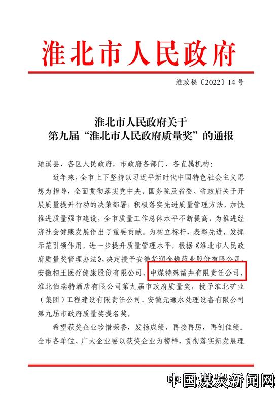 | 中煤特凿公司荣膺第九届淮北市人民政府质量奖! | |||