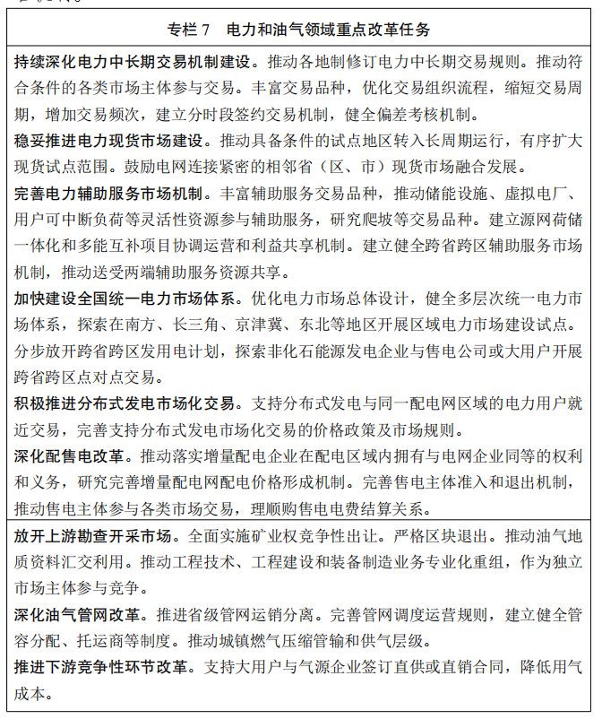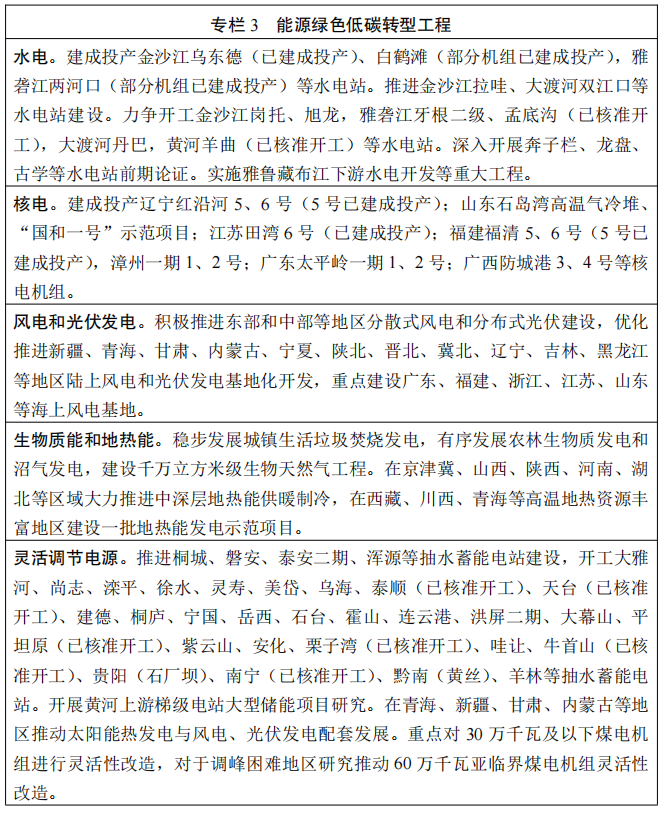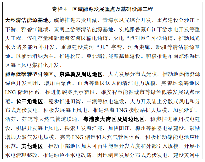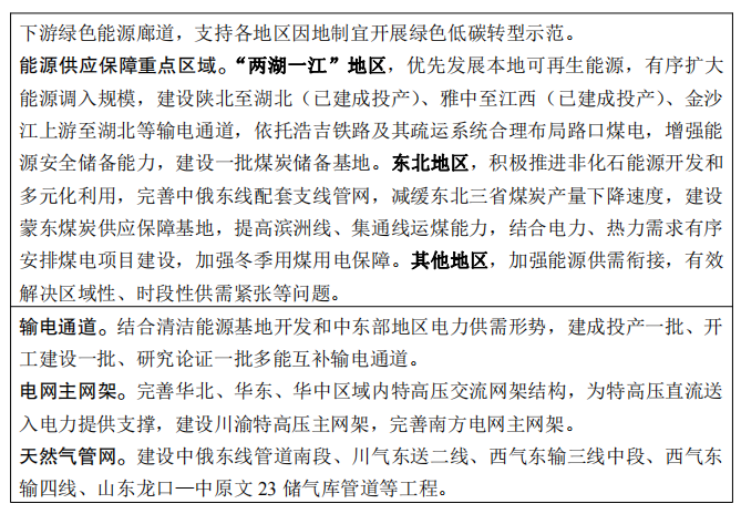 国家发改委、国家能源局发布《“十四五”现代能源体系规划》,对比此前发布的《中华人民共和国国民经济和社会发展第十四个五年规划和2035年远景目标纲要》(以下简称“《十四五纲要》”),关于煤电的表述有很多变化。 《“十四五”现代能源体系规划》的表述是“合理建设……” 根据发展需要合理建设先进煤电 充分发挥现有煤电机组应急调峰能力,有序推进支撑性、调节性电源建设。 随后,国家能源局有关负责同志解读了这一重磅文件,他表示: 要稳住存量,发挥好煤炭、煤电在推动能源绿色低碳发展中的支撑作用,有序释放先进煤炭产能,根据发展需要合理建设支撑性、调节性的先进煤电,着力提升国内油气生产水平。 3月22日,中共中央政治局常委、国务院副总理韩正主持召开煤炭清洁高效利用工作专题座谈会。韩正表示,要深刻认识推进煤炭清洁高效利用是实现碳达峰碳中和目标的重要途径,统筹做好煤炭清洁高效利用这篇大文章,科学有序推动能源绿色低碳转型,为实现高质量发展提供坚实能源保障。 2021年3月下发的《中华人民共和国国民经济和社会发展第十四个五年规划和2035年远景目标纲要》,对煤电的表述是“合理控制……” 合理控制煤电建设规模和发展节奏,推进以电代煤 同时,《“十四五”现代能源体系规划》对煤电的火电灵活性改造、“三改联动”也提出了具体目标: 力争到 2025 年,煤电机组灵活性改造规模累计超过2亿千瓦 重点对30万千瓦及以下煤电机组进行灵活性改造,对于调峰困难地区研究推动60万千瓦亚临界煤电机组灵活性改造。 有序淘汰煤电落后产能,“十四五”期间淘汰(含到期退役机组3000万千瓦。 当然,大力发展风电、光伏等大方向依旧不变。《“十四五”现代能源体系规划》指出,展望2035年,可再生能源发电成为主体电源。 《“十四五”现代能源体系规划》要点梳理如下: 到2025年,灵活调节电源占比达到24%左右,电力需求侧响应能力达到最大用电负荷的3%~5%。 到2025年,国内能源年综合生产能力达到 46 亿吨标准煤以上,发电装机总容量达到约30亿千瓦。 展望2035年,非化石能源消费比重在2030年达到25%的基础上进一步大幅提高,可再生能源发电成为主体电源。 发挥煤电支撑性调节性作用。统筹电力保供和减污降碳,根据发展需要合理建设先进煤电,保持系统安全稳定运行必需的合理裕度,加快推进煤电由主体性电源向提供可靠容量、调峰调频等辅助服务的基础保障性和系统调节性电源转型,充分发挥现有煤电机组应急调峰能力,有序推进支撑性、调节性电源建设。 水电 推动金沙江上游、雅砻江中游、黄河上游等河段水电项目开工建设。实施雅鲁藏布江下游水电开发等重大工程。推动西南地区水电与风电、太阳能发电协同互补。到2025 年,常规水电装机容量达到 3.8 亿千瓦左右。 建成投产金沙江乌东德(已建成投产)、白鹤滩(部分机组已建成投产),雅砻江两河口(部分机组已建成投产)等水电站。推进金沙江拉哇、大渡河双江口等水电站建设。力争开工金沙江岗托、旭龙,雅砻江牙根二级、孟底沟(已核准开工),大渡河丹巴,黄河羊曲(已核准开工)等水电站。深入开展奔子栏、龙盘、古学等水电站前期论证。实施雅鲁藏布江下游水电开发等重大工程。 核电 到2025年,核电运行装机容量达到7000万千瓦左右。推动电力系统向适应大规模高比例新能源方向演进。加大力度规划建设以大型风光电基地为基础、以其周边清洁高效先进节能的煤电为支撑、以稳定安全可靠的特高压输变电线路为载体的新能源供给消纳体系。 调峰电源 力争到2025年,煤电机组灵活性改造规模累计超过2亿千瓦,抽水蓄能装机容量达到6200万千瓦以上、在建装机容量达到6000 万千瓦左右。 重点对30万千瓦及以下煤电机组进行灵活性改造,对于调峰困难地区研究推动60万千瓦亚临界煤电机组灵活性改造。 煤电去产能 有序淘汰煤电落后产能,“十四五”期间淘汰(含到期退役机组)3000 万千瓦。 三改联动 大力推动煤电节能降碳改造、灵活性改造、供热改造“三改联动”,“十四五”期间节能改造规模不低于 3.5 亿千瓦。 特高压 有序推进大型清洁能源基地电力外送,提高存量通道输送可再生能源电量比例,新建通道输送可再生能源电量比例原则上不低于 50%,优先规划输送可再生能源电量比例更高的通道。 “十四五”期间,存量通道输电能力提升4000万千瓦以上,新增开工建设跨省跨区输电通道6000万千瓦以上,跨省跨区直流输电通道平均利用小时数力争达到4500小时以上。 西部清洁能源基地 “十四五”期间,西部清洁能源基地年综合生产能力增加3.5亿吨标准煤以上。 东部&中部清洁能源 “十四五”期间,东部和中部地区新增非化石能源年生产能力1.5 亿吨标准煤以上。 大力支持发展中国家能源绿色低碳发展,不再新建境外煤电项目。 国家能源局就《“十四五”现代能源体系规划》答记者问 经国务院批复同意,近日,国家发展改革委、国家能源局印发《“十四五”现代能源体系规划》(以下简称《规划》)。《规划》对“十四五”时期加快构建现代能源体系、推动能源高质量发展作出哪些部署?记者专访了国家能源局有关负责同志。 问:我们注意到,“十四五”能源规划的名称与“十二五”“十三五”有了新变化,请问如何理解“现代能源体系”?“十四