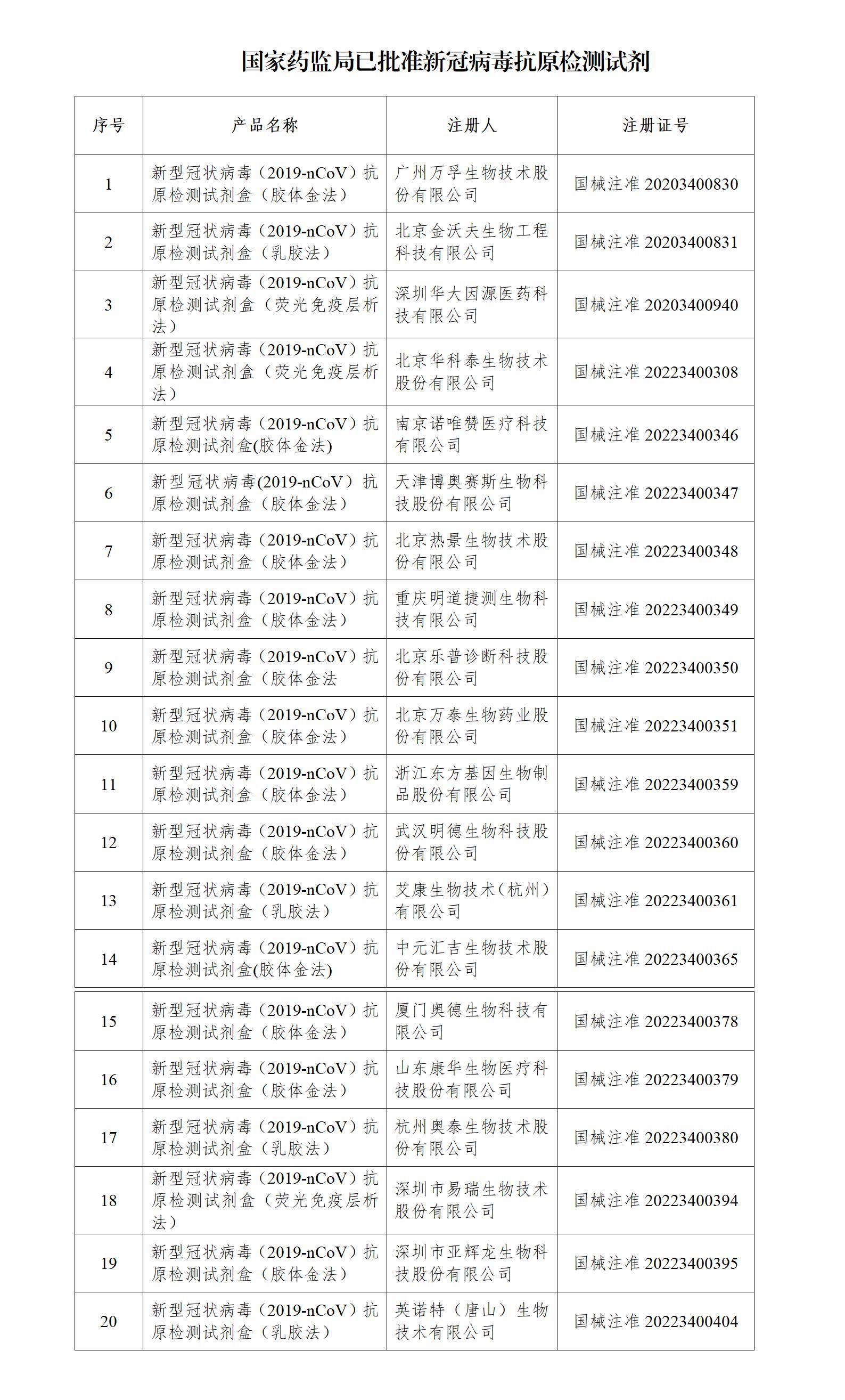 3月29日,经国家药监局审查,批准1个新冠病毒抗原检测试剂产品。截至3月29日,国家药监局已批准20个新冠病毒抗原检测试剂产品。