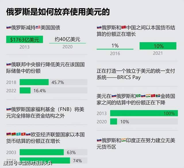 第一招:减持美国国债。 美国一遇到大事就疯狂打开印钞机,新冠疫情在美爆发以来,美国印了近10万亿美元来拯救美国市场,每次美国疯狂印钞,全世界都会跟着倒霉。大量印钞导致美国通货膨胀率上升,对外债务激增,2021年底美债规模突破30万亿美元,因此美国需要加速欧洲大量的资本回流,这也是美国为什么要一再“拱火”俄乌战争的原因之一。 俄罗斯到2020年持有美债仅40亿美元,2021年底再度把数字降低到24亿美元左右,美国冻结俄罗斯的美元资产,并未对俄罗斯造成多大影响。 第二招:降低美元外汇储备及国有储备占比,将美元完全踢出俄罗斯国家福利基金资金结构。 俄罗斯多次表态要加速去美元化,2015年在俄罗斯、白俄罗斯及哈萨克斯坦三国元首会议中,俄总统普京就强调,俄罗斯要采取去美元化措施。俄罗斯央行行长纳比乌琳娜曾提议,2021年6月俄罗斯国家福利基金将开始“美元清零”计划。2021年6月3日,俄政府在圣彼得堡经济论坛上再提该计划,宣布俄罗斯要在2017年7月5日前实现这个目标,2028-2030年俄罗斯要全面摆脱美元束缚。 2018年到2022年短短4年间,美元占俄罗斯国际储备的份额下降到不足两成,美元也被俄罗斯国家福利基金清扫,俄罗斯去美元的决心可见一斑。 第三招:增加和欧亚经济联盟国家及中国以本币结算的份额。