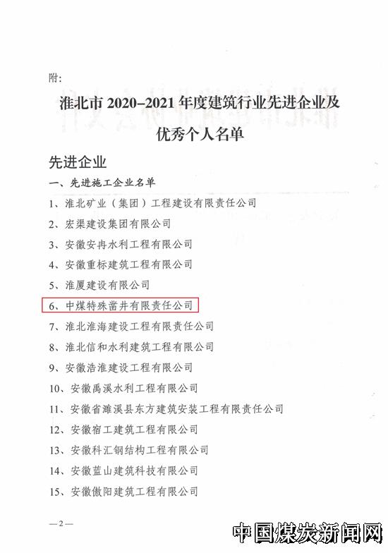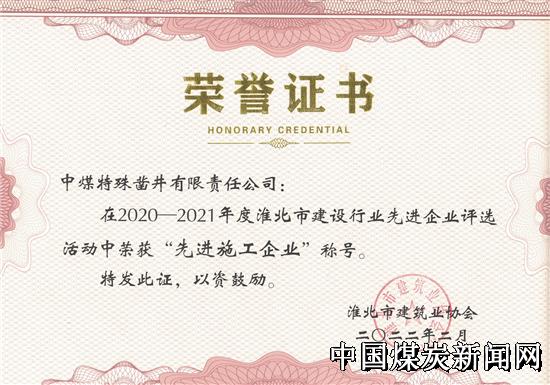 | 喜讯!中煤矿建特凿公司获评淮北市 “先进施工企业” | |||