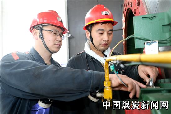 图为:4月3日,保运一区职工正在副井检修提升系统闸瓦间隙保护装置。