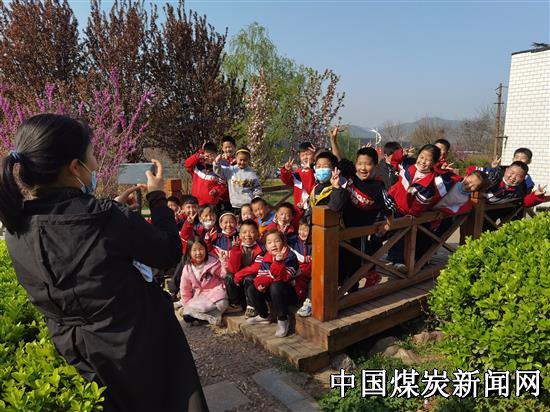 【本网讯】春风送暖,花开矿山。4月5日,河南能源义煤公司石壕煤矿游园迎来了一群可爱的学生,拍班级照、观池中鱼、赏枝头花,孩子们在春光下放飞自我、感受春意盎然的矿山。图为陕县第四学校师生在矿区花园里拍照、游玩。