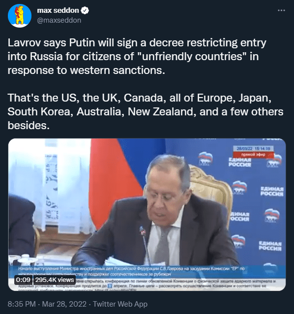 | 俄罗斯对“不友好国家”实施签证限令,外交护照也无法免签 | |||