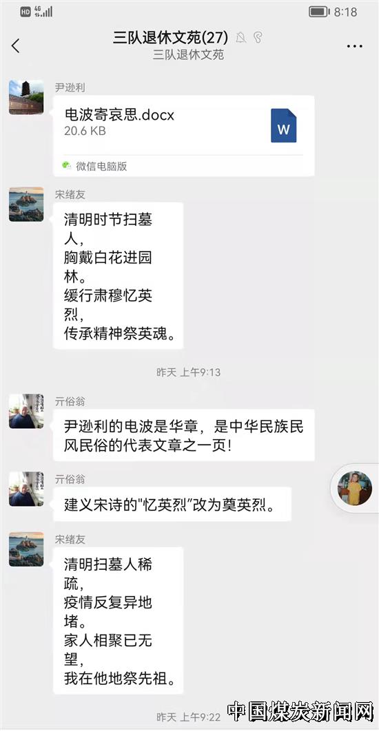 【本网讯】为进一步践行文明风尚,让绿色清明深入人心,在2022年清明节到来之际,山东省煤田地质局三队离退休党总支高度结合当前疫情防控形势,积极倡导离退休老同志树文明新风尚,先后通过建立“三队退休文苑”微信群、“以文寄哀思”征文活动等,共享绿色清明节。 ![]() 在“三队退休文苑”微信群和征文活动中,大家通过发表诗句、散文、图片等,缅怀先人、致敬烈士、感恩英雄。