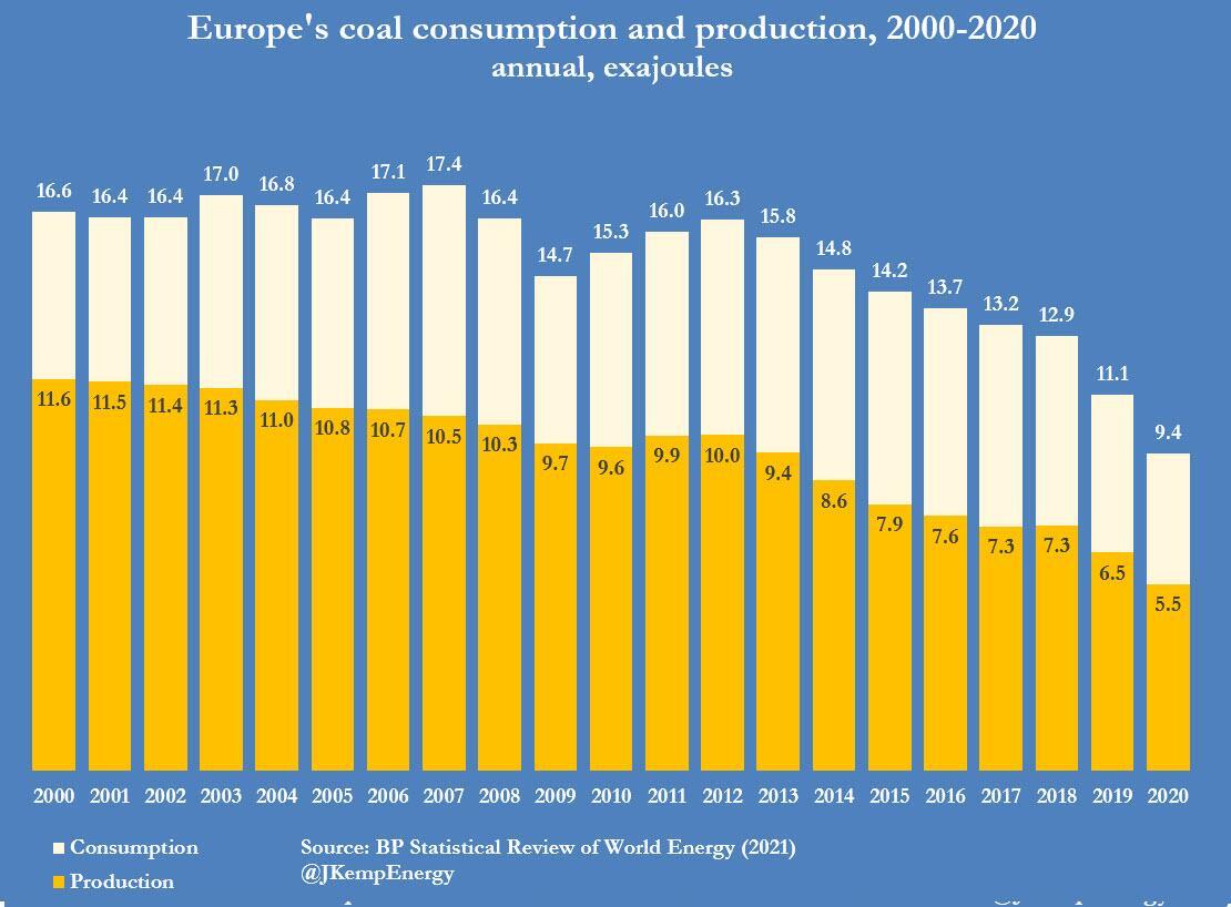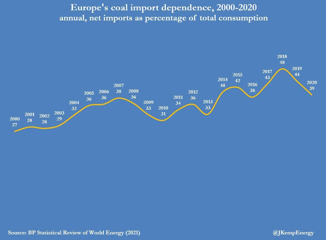 根据英国石油公司发布的“2021年世界能源统计回顾”显示,欧洲进口煤炭占到其消费量的40%以上,而在本世纪初,这个比例还不到30%。