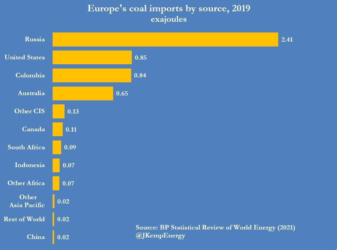 在2019年和2020年,俄罗斯供应了欧洲大约50%的煤炭进口,占该地区总消费量的20%以上。