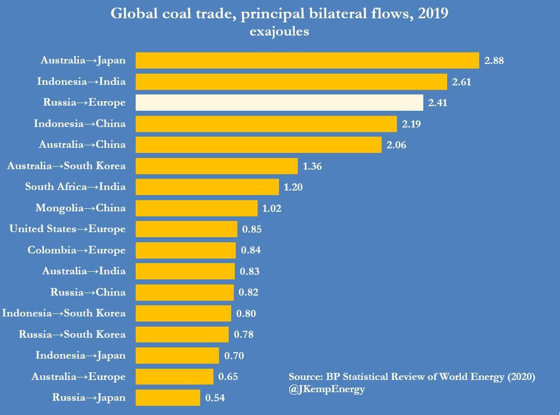 其中在2019年,俄罗斯对欧洲的煤炭出口在是当年的全球第三大出口贸易,在2020年也位列全球第五。