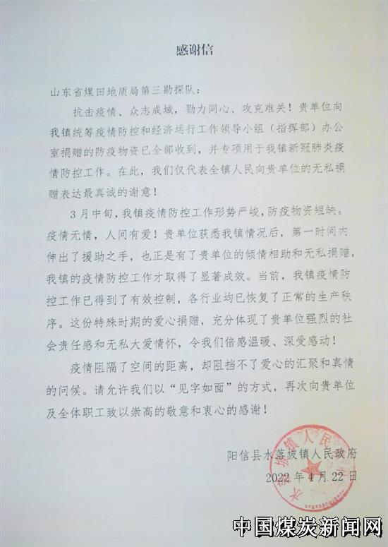 【本网讯】近日,山东省煤田地质局三队先后收到了阳信县应急管理局、阳信县水落坡镇人民政府发来的感谢信,感谢山东省煤田地质局三队心系地方、情系民生,为阳信县水落坡镇捐赠防疫物资,助力地方抗疫工作。