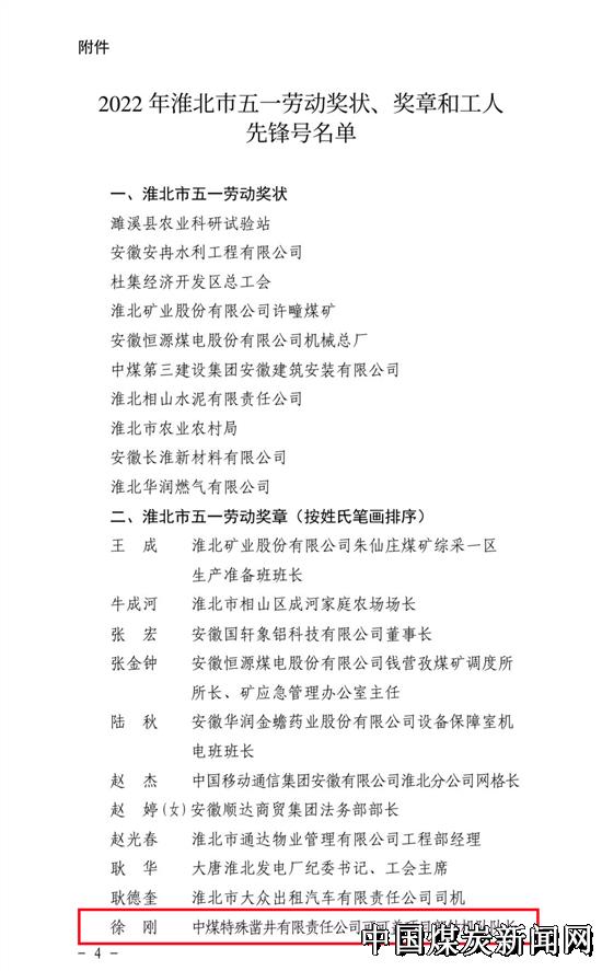 日前,公司可可盖项目部副经理徐刚被授予“淮北市五一劳动奖章”荣誉称号。