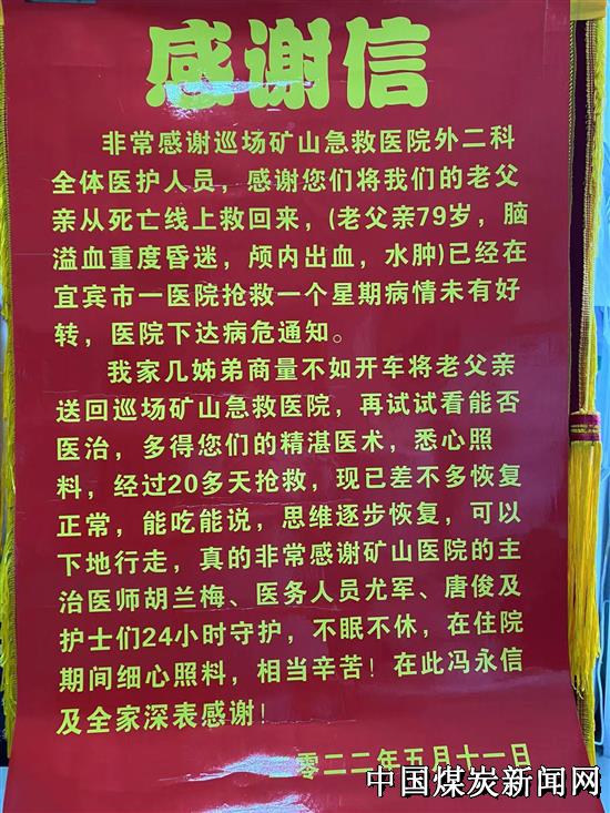 【本网讯】5月11日,宜宾市矿山急救医院普外科收到来自患者的感谢信,信中表达了对科室医护人员的感激之情。 ![]() 2022年4月17日,患者冯某外出散步时不慎摔伤致意识障碍,在一家医院治疗一周后,病情进一步加重。为解决病疼,患者家属经多方打听后,来到宜宾市矿山急救医院外科寻求治疗。该科贺卫国主任和胡兰梅医生立即联系相关科室给患者进行全面检查,并一起制定详细的用药、治疗方案,同时每天由医生详细查看患者病情,根据病情变化及时调整用药和治疗。 ![]() ![]() 为表达对医务人员的感谢。出院当天,患者家属送来锦旗和感谢信。浓浓医患情,是对医护人员的肯定和信任。像这样的感谢信,该院已经收到数封。正是这一封封的感谢信,鼓励、鞭策着矿山急救医院全体医务人员不断进取,不断提升服务质量、提高医疗水平,更好的为全县人民的健康保驾护航!