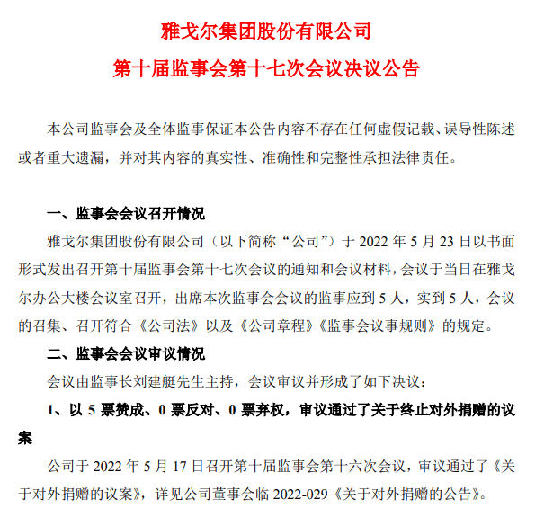 央广网北京5月24日消息(记者于琦)离宣布捐赠13.6亿元资产不到一周的时间,雅戈尔又反悔了。 5月23日晚间,雅戈尔发布公告称,公司董事会、管理层听取广大股东意见后,公司决定终止本次对外捐赠事项。因此,原定于2022年6月2日召开的2022年第一次临时股东大会同时取消。