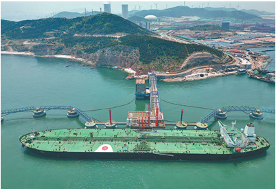 5月23日,在山东港口烟台港30万吨级原油码头,一艘油轮正在卸船。烟台港依托“集成式”能源储运服务体系,在船期跟踪、动态调配、生产工艺等方面加强协同,深挖潜力,实现各环节无缝衔接,保障能源物流稳定畅通。唐 克摄(人民视觉)