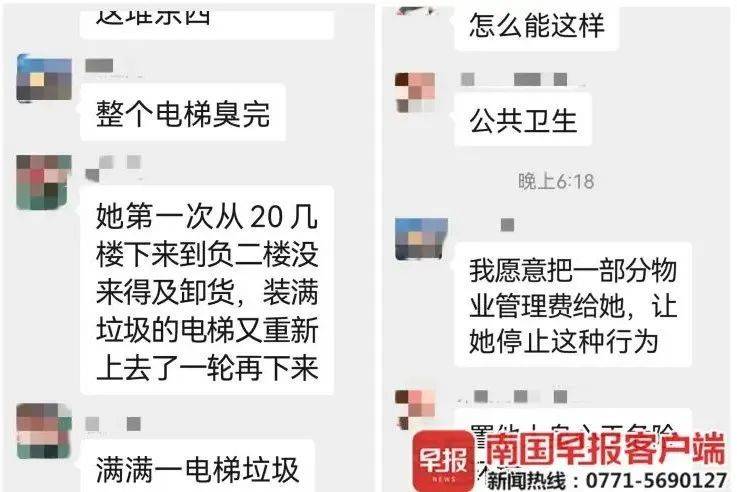 ▲业主群里,大家的意见很大。 物管无奈准备起诉 老人摔伤工作暂停 4月27日,小区物业服务中心办公室主管韦先生称,物管曾多次联合社区、派出所等部门的工作人员上门做工作。“跟巫阿婆的子女反映过,没用。”韦先生说,今年3月底物管无奈才想出收取电梯费的办法,同时着手收集证据准备起诉。结果巫阿婆拿到缴费通知单后没有交钱,反将它贴回了物业办公室门上。 日前,巫阿婆在家里摔伤,物管知道后拨打120将她送医治疗。4月27日,韦先生表示,他对老人摔伤一事表示同情,如果她康复后不再捡垃圾,物管就既往不咎。但她若一如既往,物管将会重启起诉工作。 老人称没有经济困难 捡垃圾是变废为宝 4月27日,记者致电巫阿婆的女儿,提及母亲捡垃圾一事,她不愿多说。 5月3日,记者电话联系上还在住院的巫阿婆。她告诉记者,她没有经济方面的困难,主要是因为一个人无聊想找事做。捡垃圾一方面能变废为宝赚点菜钱,另外一方面也能锻炼身体。 至于未来是否会再捡废品,巫阿婆表示先养好身体再说。整个采访过程中,巫阿婆精神状态不错,思路清晰。 律师:物管催收相关费用 于法有据 南国法援公益律师赵明堂分析,公民合法的权益受法律保护,但是公民不能因为自己行使个人权利,就对其他人的个人权利造成侵害。从道德层面来讲,老人值得同情,但如果老人确实频繁使用公用电梯,致使公摊费用增加,侵犯到邻居的利益,物管代表全体业主向老人索赔于法有据,这也是变相阻止老人继续侵害他人的合法权益。 此外,如果老人在公共楼道分拣垃圾或者把垃圾带回家,确实影响到邻居的居住环境,而社区和民警劝阻不成的话,可以要求子女对其采取有效的管护措施,也可以向法院申请下达禁止令。