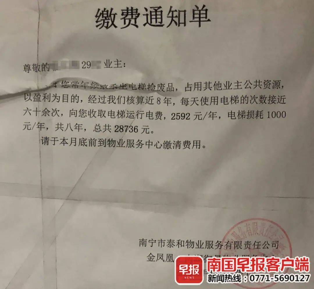 近日,南宁一则特别的物业缴费通知单引发热议,一业主近8年频繁乘坐电梯捡垃圾,被物管催收近3万元费用。 频繁坐电梯要交钱? 缴费通知单引关注 “由于您常年频繁乘坐电梯捡废品,每天使用电梯的次数六十余次,向您收取电梯运行电费2592元/年,电梯损耗1000元/年,8年共28736元……”4月26日,一则物业缴费通知单在南宁人的微信群传开,引发关注。