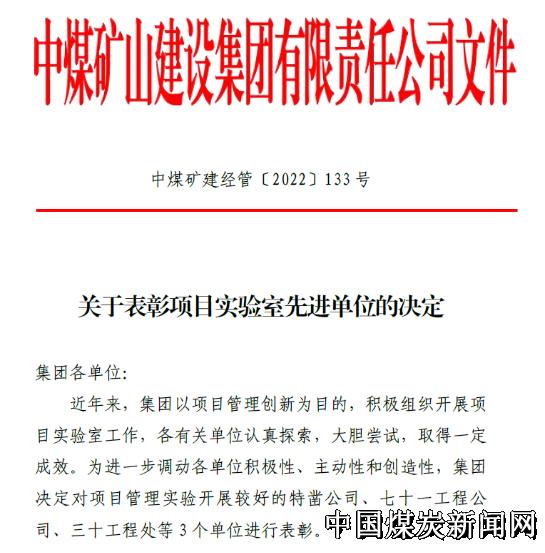 【本网讯】近日,中煤矿建集团开展了项目实验室先进单位表彰工作,中煤矿建特凿公司荣获集团项目实验室先进单位称号。