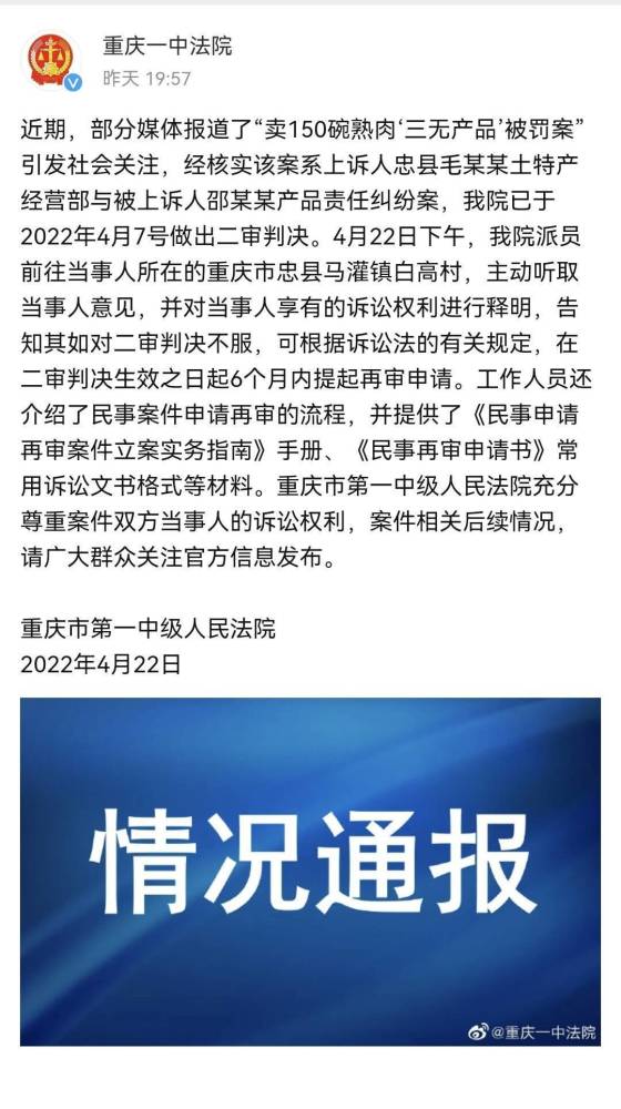 王云听代理律师讲述完整个过程后表示:“我有信心法院会启动再审,我相信法院会给我一个公平正义的判决。我有这份底气,是因为我的产品没有任何问题,都是我们一家人费心费力,用心每一道工序做出来的产品,既然产品没有问题,那么何来畏惧,何来妥协?这场官司我一定会坚持到底!” 王云承认因为案子,给生意带来了一些影响,但就当作“沉淀自己,让自己可以静下心来研究农村美食,希望把这些美食做得更好”。王云还说:“我想把祖祖辈辈传下来的这份手艺继续传承下去,让更多远在他乡的人们能够吃到正宗的家乡味。” “我坚持打这场官司,主要有两个原因,首先我的产品过硬,经得起任何检验,我要为自己讨回一个公道。其次,我明白农村人创业有多么艰辛,他们很多人都吃过哑巴亏,但最终选择了妥协,我想为千千万万返乡创业的农民打一场官司,希望能为他们树立一个标杆。”王云说。 被申请人邵某:有问题直接联系律师 6月10日晚,封面新闻记者致电被申请人邵某,他说:“我花钱请了比我更专业的律师,我觉得由他们去处理比我更好,有其他问题你可以直接联系我的律师。” 11日早上,封面新闻记者联系上邵某的两位代理律师——北京中凯(上海)律师事务所杜鹏律师和河南洛太律师事务所裴杰律师。杜鹏律师表示:“本次询问、听证充分保障了诉讼参与人的各项权利,诉讼当事人双方都充分的举证、质证、答辩、辩论,整体进行得很顺利。” 关于双方争议较大的“熟食是否为预包装食品”问题,裴杰律师表示,王云在销售粉蒸肉、烧白、回锅肉时采用了预先包装,用一碗一份的形式按个进行售卖,符合《食品安全法》和《食品经营许可管理办法》关于预包装食品的定义。他认为,王云应当按照《食品安全法》的强制性要求,粘贴标签、标示。 “即使按照王云陈述的其生产的食品属于散装食品,也应当按照《食品安全法》的要求粘贴标签、标示。“裴杰律师说,标签、标示是食品安全标准的重要组成部分,没有标签、标示的产品严重侵犯了消费者的知情权。 两位代理律师均表示:“对于法院如何审理案件,我们尊重法院的裁决,我们相信法院会公正裁决。” “本案一个重大意义在于让之前生产销售不规范的食品经营者了解到,法律为确保食品安全规定了如此严厉的惩罚措施,从而促使食品经营者更注重从每一个细节来规范生产、销售行为,同时通过个案普法使消费者在食品消费时也更注重细节,确保广大人民群众舌尖上的安全。”两位代理律师如是表示。 据了解,重庆市高级人民法院将会根据双方提交的证据,并结合相关的调查核实情况,最终决定是否启动再审程序。 依据相关程序规定,再审案件立案审查后,三个月内法院将会作出裁定。 案件回溯: 销售自制熟肉被诉“三无产品” 两审均败诉并作10倍赔偿 这起“卖150碗熟肉‘三无产品’被罚案”,要从2021年底的一天说起。那天,王云收到忠县法院的传票。一名姓邵的顾客将她和她的土特产经营部起诉了,要求退还4499.16元货款,并赔偿10倍货款,也就是44991.6元。 王云介绍,她和丈夫之前在外打工,婆婆在家经常会做泡菜、粉蒸肉等当地特色食品。2017年以来,她先后注册登记了营业执照、食品加工生产小作坊登记证和食品经营许可证,与丈夫一起回家帮婆婆扩大生产,她通过自己的短视频账号进行销售。 2019年,邵某看到王云发布的视频,联系购买了一批泡菜。2021年7月份,邵某又向王云一次性订购了粉蒸肉、咸菜回锅肉等150份扣碗类产品,累计4499.16元。 之后,邵某将收货过程进行全程录像。8月份,邵某以“这些东西没有标注生产日期、生产地址、保质期等产品信息,是三无产品”为由,起诉王云,要求退还近4500元货款,且按货款的10倍金额予以赔偿,共计约5万元。 2021年底,一审判决王云退回邵某4499.16元货款,并支付邵某10倍赔偿共计44991.6元。 王云不服一审判决,向法院上诉。4月21日,王云收到二审判决,依然败诉。判决书显示:于本判决生效之日起十日退还原告邵某货款 4499.16元并赔偿原告44991.6元。 4月22日晚,重庆市第一中级人民法院发布情况通报。 4月22日下午,重庆市第一中级人民院派员前往王云居住地,主动听取当事人意见,告知其如对二审判决不服,可在二审判决生效之日起6个月内提起再审申请。4月29日,王云将相关材料提交给重庆市一中院。 来源:封面新闻