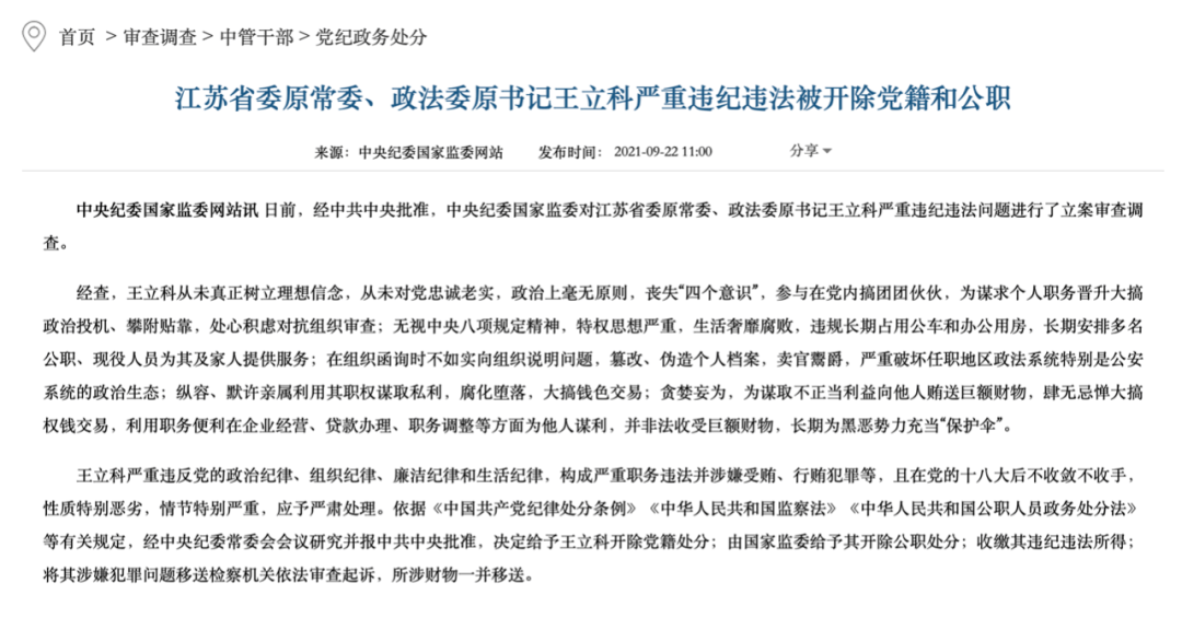 2021年9月22日,王立科被双开,2021年12月29日被公诉。