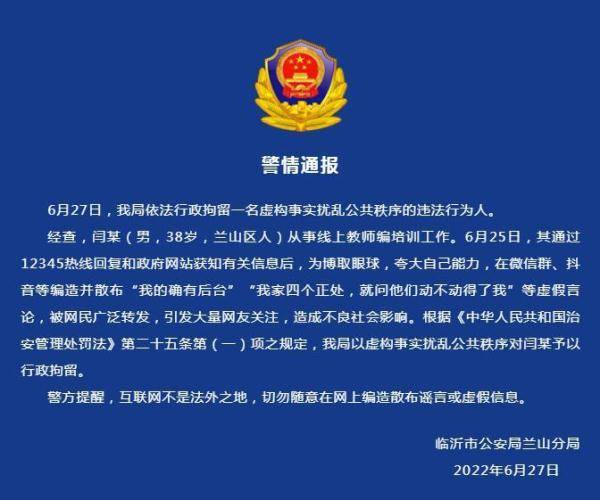 | 男子编造散布“我的确有后台”等虚假言论,临沂兰山警方:行政拘留 | |||