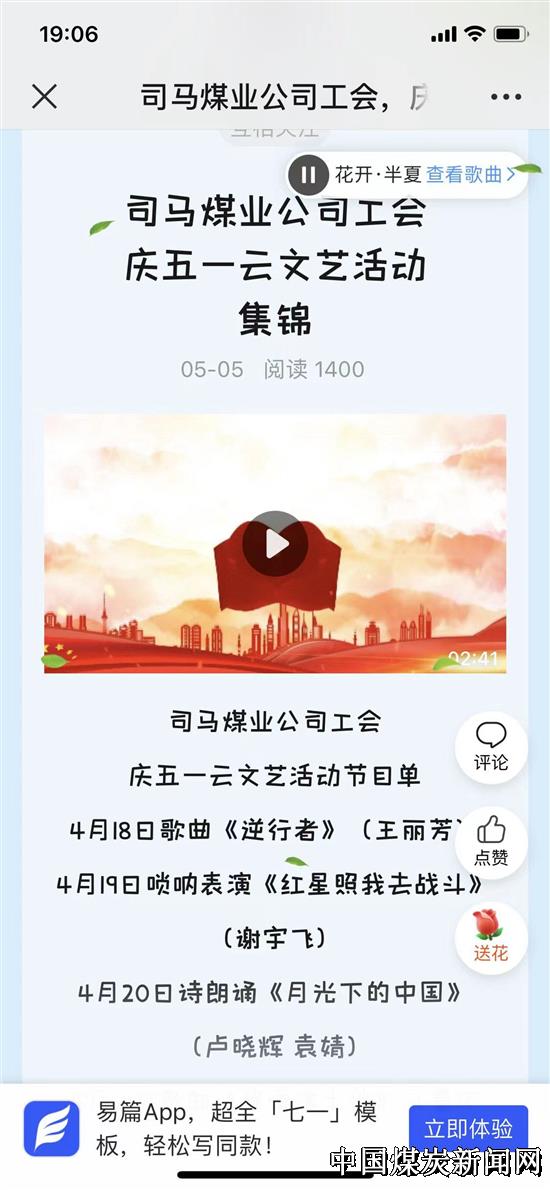 近年来,由于疫情的原因,催生出许多活动新形式,云演出、云培训、云文艺、云展示就是其中的佼佼者,各项云活动为众多的文艺爱好者提供了更加广阔的舞台。该公司工会审时度势,不甘落后,充分利用潮流趋势,以服务矿区、教育职工为根本,在宣传安全生产的同时,为矿工的才华展示搭建平台,提供更加广阔的舞台,从而使职工文艺、文化活动有声有色、丰富多彩。该公司这一举动,不仅引得兄弟单位纷纷效仿,更获得了潞安百里矿区职工群众发自内心的欢呼与喜爱。