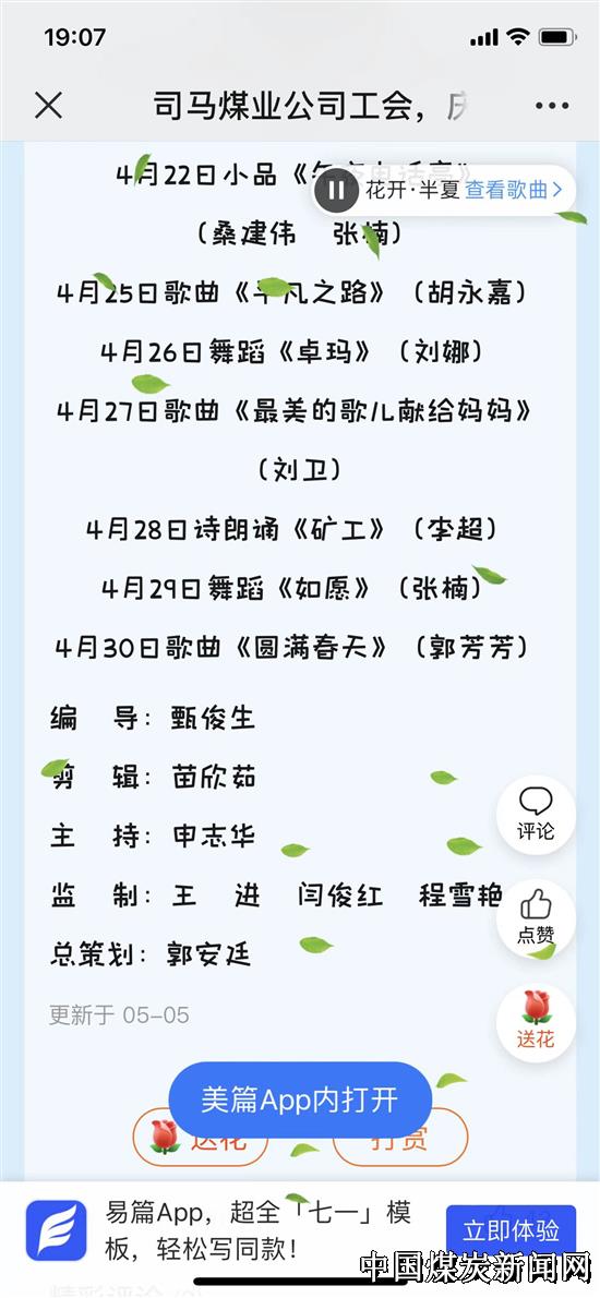 【本网讯】为了充实职工业余文化生活,充分展示职工才艺,潞安化工集团司马煤业公司工会结合疫情防控形式,开阔思路、拓宽渠道,组织举办了多项职工云文艺活动,通过网上文艺展示,传播优秀文艺作品,陶冶职工情操,此举受到了该公司广大干部员工的一致好评。
