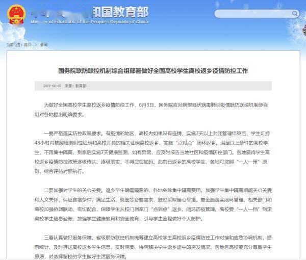 满足这些条件,疫情地区返乡也无需隔离 在会上,国家卫生健康委疾控局副局长、一级巡视员雷正龙强调,各地应进一步提高防控措施的科学性、精准性、针对性,坚决防止简单化、做到“九不准”。其中包括不准对来自低风险地区人员采取强制劝返、隔离等限制措施、不准随意扩大采取隔离、管控措施的风险人员范围、不准对符合条件离校返乡的高校学生采取隔离等措施等。 但仍有学生反映学校所在地发生疫情,所在学校处于低风险地区,返乡后却被要求集中隔离的情况。 那么,究竟什么样的情况返乡的高校学生需要集中隔离,什么样的情况无需隔离? 针对这一问题,刘培俊明确:有疫情的地区,高校校园内如果没有疫情,学生完成7天以上的封闭管理后,按照学校规定和安排,学生可持本校开具的相关证明,以及48小时内核酸检测阴性证明离校返乡,从学校到返乡目的地“点对点”闭环方式返乡回家。满足以上条件的高校学生到达返乡目的地后,不再集中隔离,到家后实施7天健康监测,如有异常情况,向当地社区和疫情防控部门报告情况。 暑假想留校搞科研、做毕设,能行吗? “尊重学生选择意愿,满足学生留校参加实习、进行实验研究、准备论文以及考试等各项合理需求。”刘培俊表示,有一部分学生因为就业、学业等相关因素选择留在校园,教育部要求各地各学校应做好留校学生的服务保障。 “学校应教育引导学生加强健康监测,坚持良好健康生活习惯,不松懈、不大意,持续做好个人防护。优化调整就餐、购物、收发快递等相关措施,按需求开放校内的学习、锻炼、科研等重点场所,满足学生就诊就医等特殊需求。”刘培俊说,高校应落实教育部和国家卫健委联合发布的高等学校新冠肺炎疫情防控技术方案(第五版),落实常态化防控措施,完善应急处置预案,精准有效做好校园疫情防控各项工作。 返乡能买到票吗? 暑假即将来临,大学生返乡将迎来高峰,回家的票好买吗? 国铁集团客运部副主任朱文忠介绍,在充分了解学生返乡需求的基础上,铁路部门将采取加开列车、加挂车厢、动车组重联等措施,提供充足运力。 “北京发往全国主要城市的列车近200列,提供席位超过12万个,完全能够满足学生返乡出行需求。”朱文忠说,在北京、广州、武汉、西安等高校集中地区,将安排一定数量的热备动车组,根据售票大数据动态,随时启动备用能力,满足突发学生客流出行需要。 来源:科技日报
