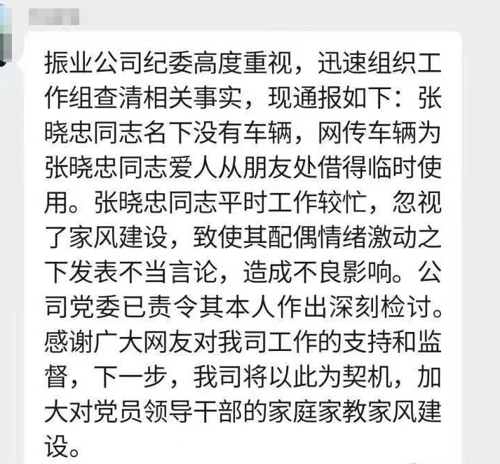 潇湘晨报(报料微信:xxcbbaoliao)记者从视频拍摄者处获悉,此事发生在深圳福田区宝能公馆停车场内,该女子与被堵劳斯莱斯车主发生争执,两人倒地。有网友称,该女子在争吵中称其老公为“某国企领导”。 据澎湃新闻报道,涉事小区一名业主称,纠纷源于开发商将住宅区的“公共”停车位使用权赠送给公寓区业主,作为“专用停车位”,引起住宅区业主不满,近半年来纠纷不断,“这件事也是和车位纠纷有关。”该小区所属街道工作人员也称,该纠纷因地产商赠车位引发,目前正在处理中。 随后有消息称,该女子口中的“某国企领导”老公,为深圳国资旗下地产上市公司——深圳市振业(集团)股份有限公司(简称:深振业A,股票代码:000006)党委委员、纪委书记、监事会主席张晓中。据上市公司公开资料,张晓中任期起始日期为2021年5月12日,终止日期为2024年5月11日。 6月5日晚,网络上传出了一份截图称:“振业公司纪委高度不重视,迅速组织工作组查清相关事实,现通报如下:张晓忠同志名下没有车辆,网传车辆为张晓忠同志爱人从朋友处借得临时使用。张晓忠同志平时工作较忙,忽视了家风建设,致使其配偶情绪激动之下发表不当言论,造成良影响。公司党委已责令其本人作出深刻检讨。感谢广大网友对我司工作的支持和监督,下一步,我司将以此为契机,加大对党员领导干部的家庭家教家风建设。”